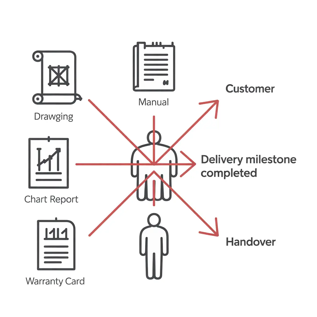 All as-built drawings, operation manuals, test reports, and warranty documents are physically handed over to the client’s site team, completing the delivery milestone.