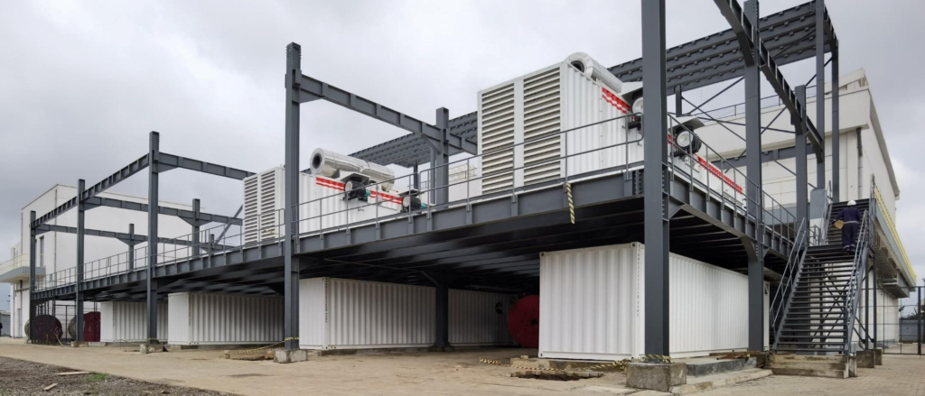 We designed a sophisticated three-level steel structure system: the ground level houses the massive double-walled Bulk Fuel Tank, leveraging the ground’s load-bearing capacity; the upper two levels are used to stack the containerized generator sets.