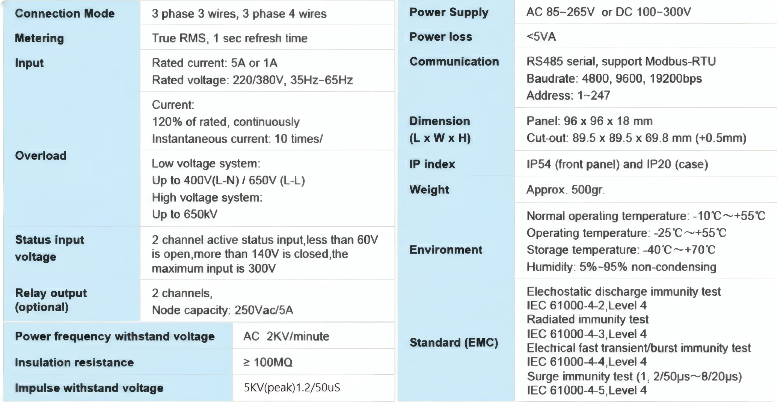 The multi-function power meter is designed to meet the power monitoring requirements of power systems, industrial and mining enterprises, public utilities, and intelligent buildings. It can measure all common electrical parameters with high precision, such as three-phase voltage, three-phase current, active power, reactive power, frequency, power factor, and four-quadrant electric energy. It adopts high-visibility LEDs to display the parameters measured by the meter and the operation information of the power grid system. The meter panel is equipped with four programming keys, allowing users to conveniently switch displays and program meter parameters on-site, which delivers strong flexibility.